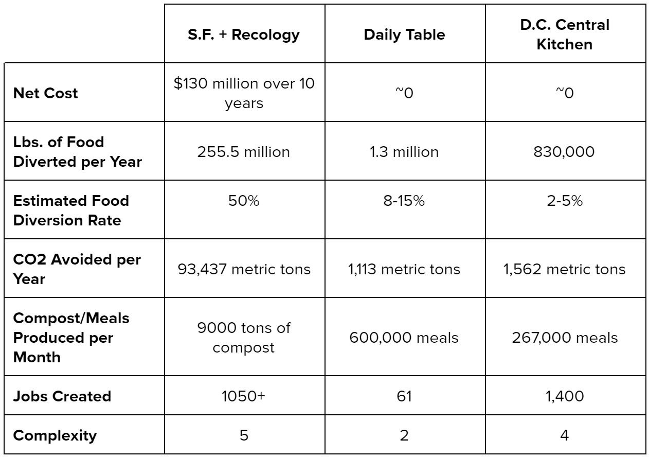 As such, much more money, time, and effort can be spent by the city of San Francisco on convincing residents and businesses to compost, while the actual logistics are handled by Recology. Daily Table and the D.C. Central Kitchen simply do not have the money to devote to capturing every pound of food they can use, nor would that necessarily align with their goals. Daily Table’s core goal is to take otherwise unsold and wasted food and sell it at a discount so the residents of Dorchester can eat healthily. On the other hand, D.C. Central Kitchen’s core goal is to address hunger and poverty, doing so through the collection of unused food to prepare meals and train adults in culinary skills. As we can see, neither program is looking to eliminate food waste. Rather, they use wasted food as a way they can improve their communities. Overall, while San Francisco makes a splash environmentally, Daily Table and D.C. Central Kitchen are much more socially focused, providing meals and jobs for their community with the food they rescue.